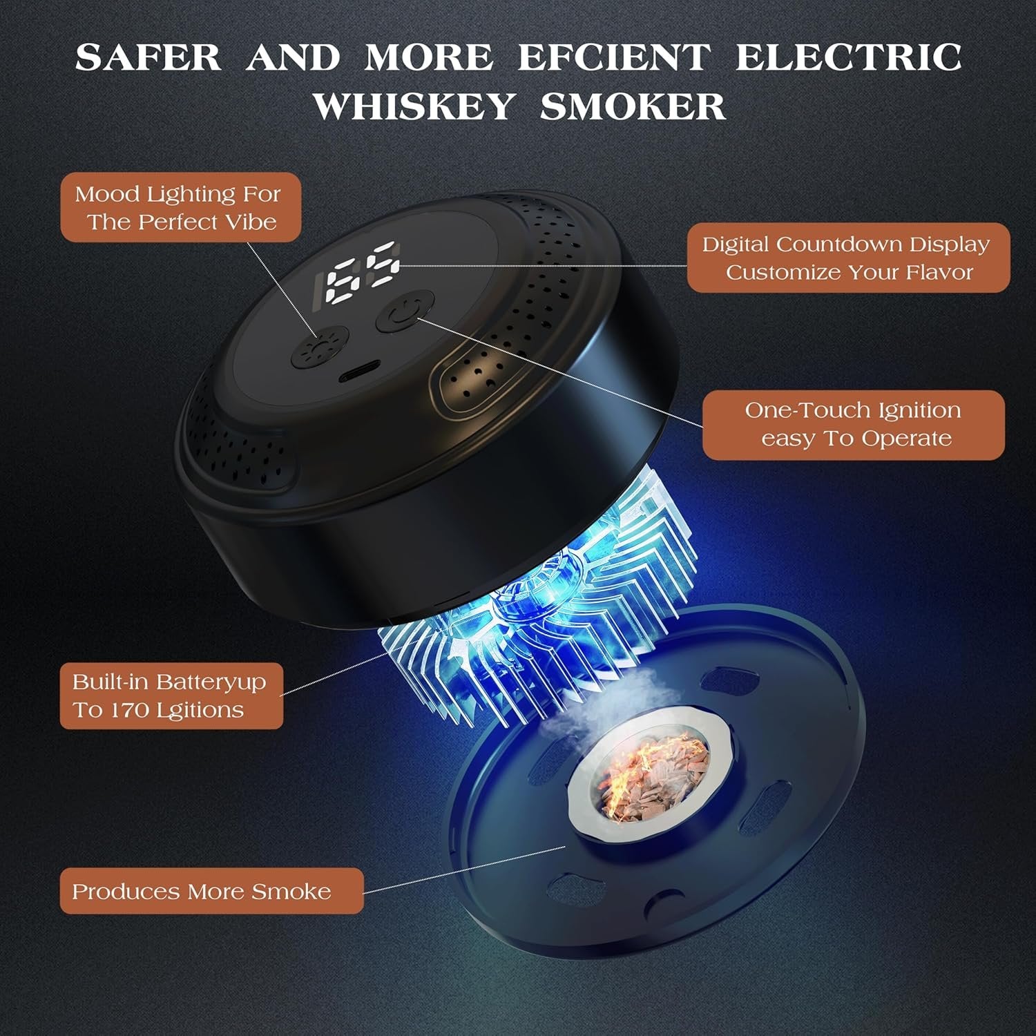 Package Includes: Electric Whiskey Smoker, 6 wood chip containers, USB-C cable, scoop, cleaning brush, user manual